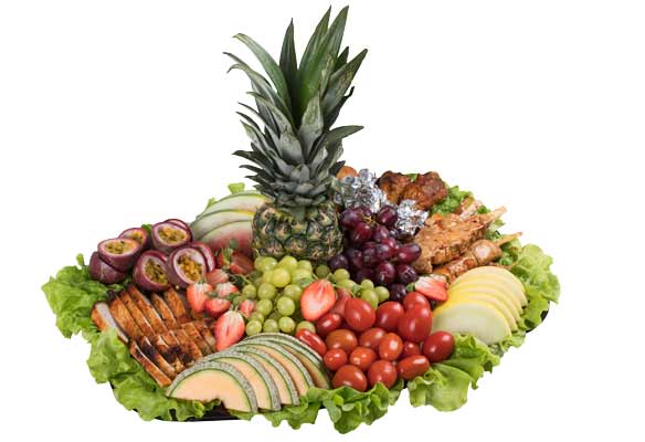 En smakrik grillplanka med kycklingspett, kycklingben och grillad ytterfilé. Serveras med frukt som melon, passionsfrukt, tomat, ananas, physalis samt röda och gröna vindruvor.