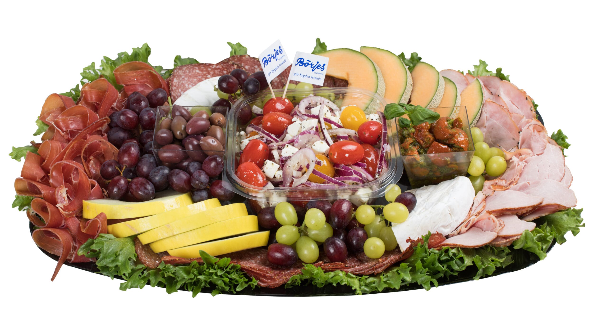 Innehåll per person: 2 sorters salami (3 skivor av varje), 2 skivor rustico, 2 skivor parmaskinka, 50 g brieost, oliver, cocktailtomater, vindruvor, physalis, 2 sorters melon. Pastasallad med soltorkad tomat, fetaost, rödlök och pasta. Baguette.