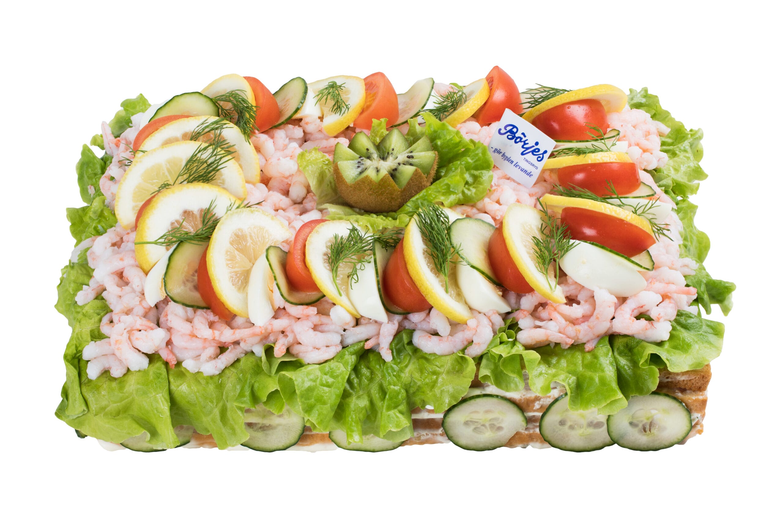 Garnering: Räkor, ägg, sallad, tomat, gurka, citron och dill.